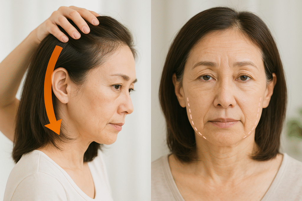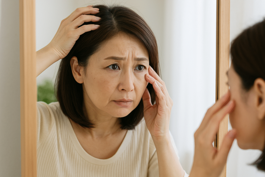 頭皮がたるむと面積が横や下に広がるため、髪の本数は同じでも地肌が目立ち、薄毛のように見えてしまいます。 - 顔のしわやたるみが進行
